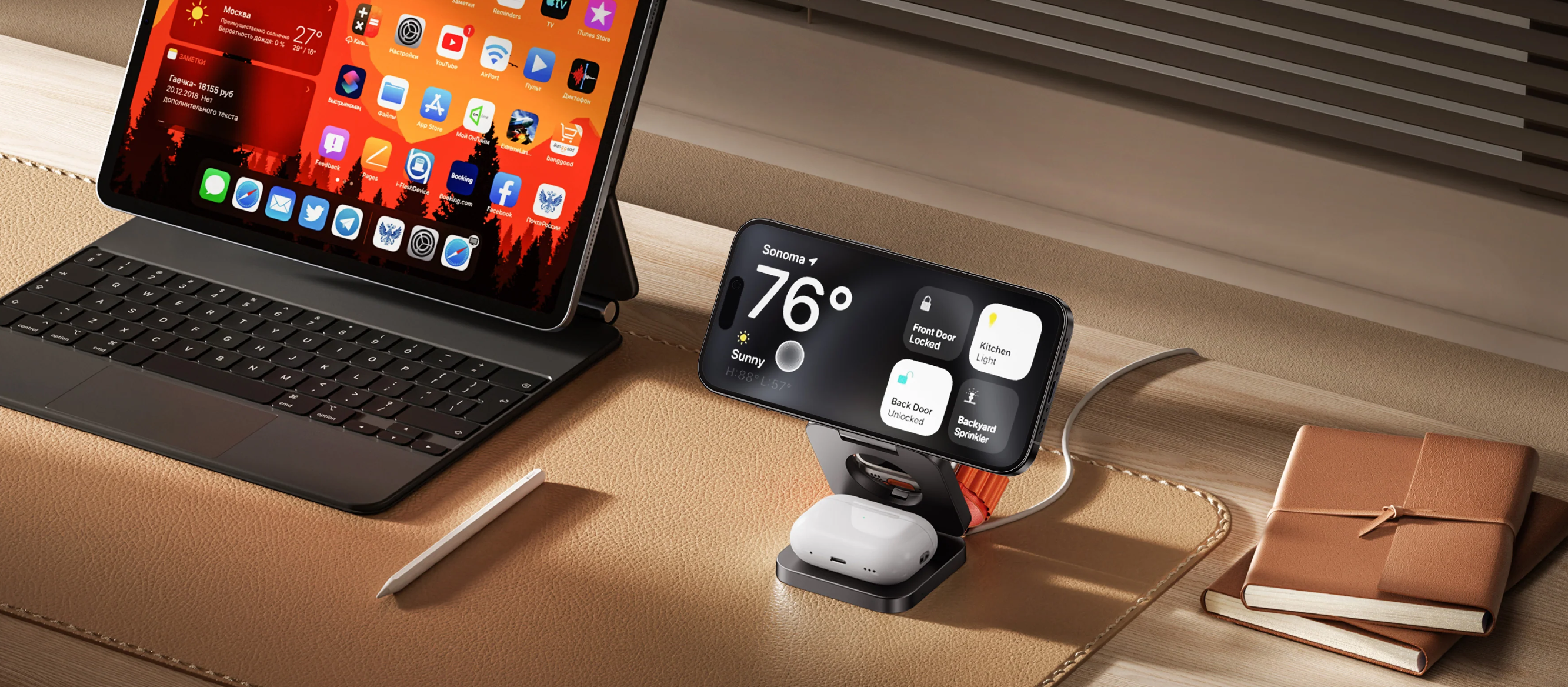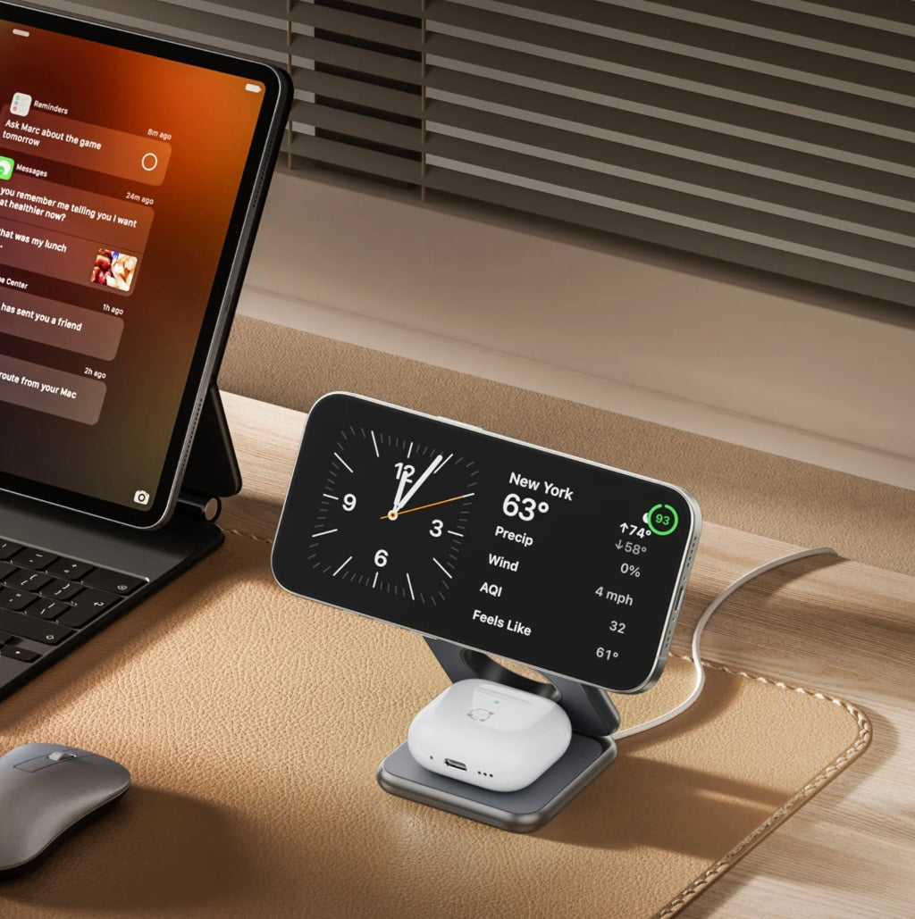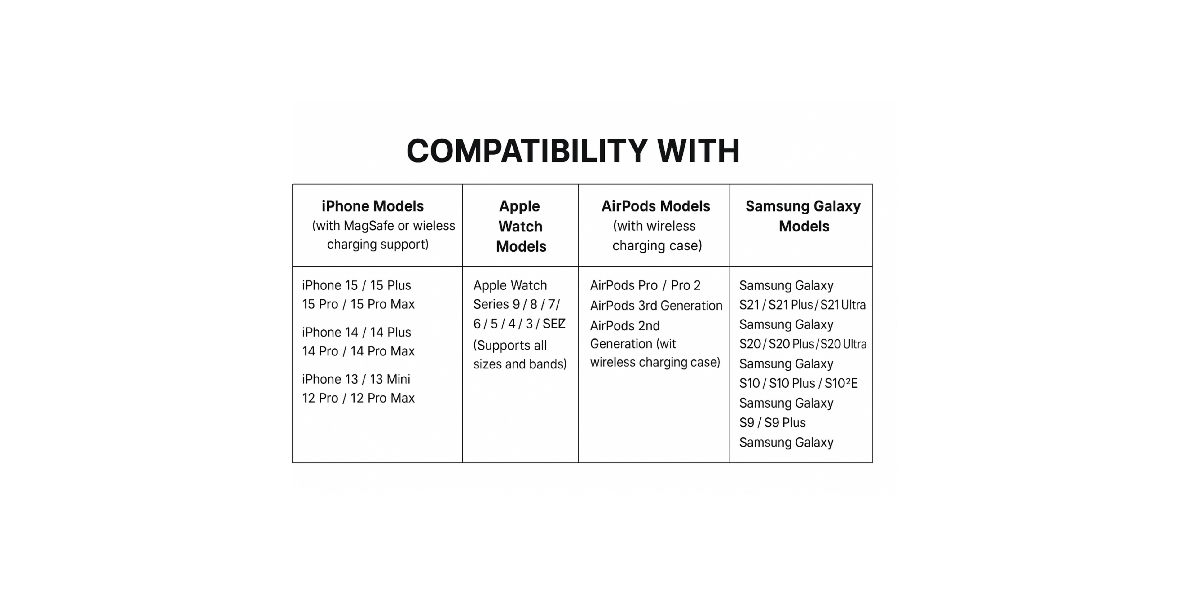 Charge your iPhone, Apple Watch, AirPods, or Samsung devices all at once with a single elegant device. Fully compatible with all MagSafe-supported iPhones and wireless charging-enabled Samsung smartphones. Say goodbye to cable clutter.